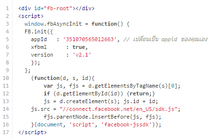 แล้วพิมพ์โค้ดลงไปก่อนดังนี้ (โค้ด) นี่คือโค้ดของการเตรียมการใช้เฟสบุ๊ค ทุกครั้งที่เรียกแอปเฟสบุ๊คขึ้นมาใช้บนบล็อกต้องพิมพ์แบบนี้ ต่อไปเราจะสร้างโค้ดสำหรับ ล็อกอินเข้าเฟสบุ๊ค