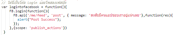โดยส่วน callback ให้ใส่ฟังก์ชันว่าเมื่อ login เสร็จแล้วทำอะไร อย่างผม login เสร็จให้โพสหน้าวอล