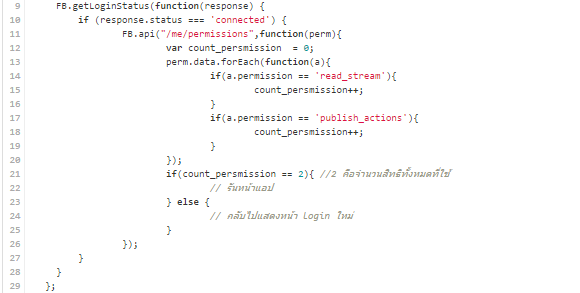 เมื่อมาถึงบรรทัดที่ 9 จะเห็นว่ามีการเรียก FB.api โดยเรียกกราฟ ไปยัง ขอบ persmission เพื่อดูว่าตอนนี้ คนใช้ให้สิทธิอะไรแก่แอปบ้าง แล้วก็ตรวจสอบว่ามีสิทธิที่เราต้องการครบหรือไม่ หาก ครบ ให้รันหน้าแอปต่อไป แต่ถ้าไม่ ให้ขึ้นหน้า login ใหม่ ที่ผมทำแบบนี้เพื่อป้องกันผู้ใช้ login มาจากแอปอื่น ที่อยู่ในบล็อกเดียวกันเพราะจะทำให้แอปของเราเอ๋อเนื่องจาก เรียกข้อมูลไปแต่โดนปฏิเสธ