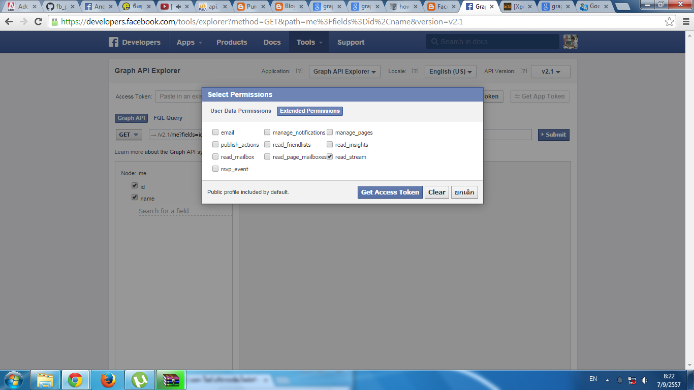 มาอธิบายโค้ดกันหน่อยดีกว่าครับ ก่อนอื่นเลยที่บรรทัด 44 จะเห็นคำว่า read_stream ครับ นั่นคือ สิทธิที่เราขอเข้าถึงข้อมูลจาก เฟสบุ๊คนะครับ ว่าเราขอสิทธิเข้าถึงหน้าวอล ถ้าอยากรู้ว่ามีสิทธิ์อะไรให้ขอบ้างเข้าไปดูที่ Graph Explorer ครับ