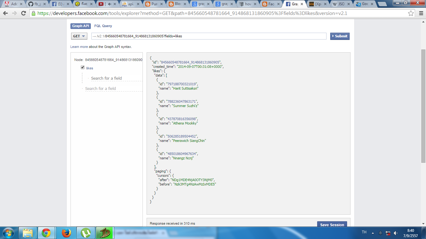 และเมื่อคลิกที่ id ของโพสและเติม fields=likes จะเห็นว่า มันจะวิ่งตามขอบ likes เพื่อไปดูว่าคนที่ไลค์โพสเรามีใครบ้างครับ