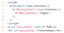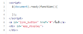 อธิบายโค้ดก่อนครับ โดยโค้ดเริ่มด้วย javascipt ซึ่งตอนนี้ <script></script> ยังคงว่างเปล่าอยู่แสดงว่าไม่มีอะไร ต่อจากนั้นมีลิ้งค์ ชื่อ link_button ซึ่งชี้ลิงค์ไปที่ หน้าเดิมอยู่ (# หมายถึงหน้าปัจจุบันนี่แหละครับ) จากนั้น มี <div> ชื่อ app_display ซึ่งตอนนี้มีคำว่าเราชอบเธออยู่นะครับ