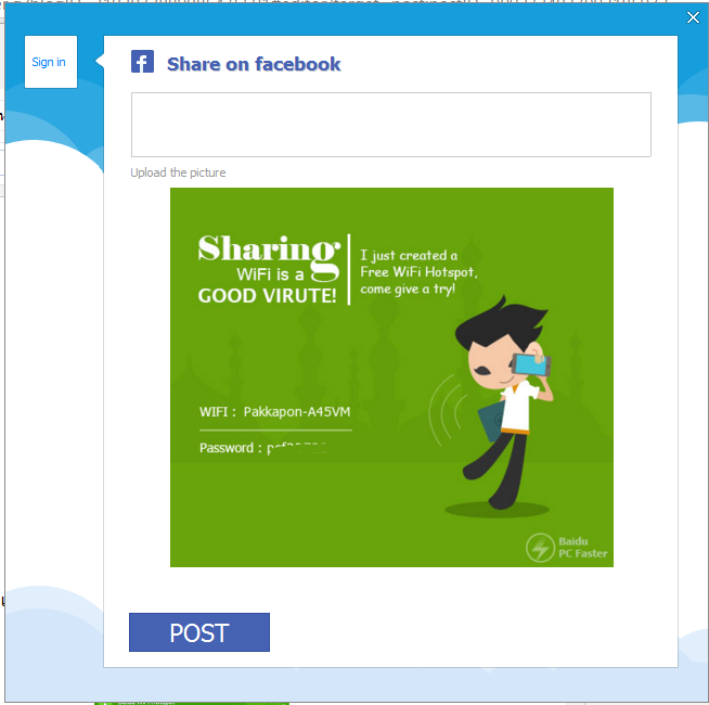 โดยเราสามารถแชร์รหัสผ่านของ wifi เราผ่านเฟสบุ๊คได้ด้วย เมื่อกดเมนู facebook บริเวณปุม 3 เส้น