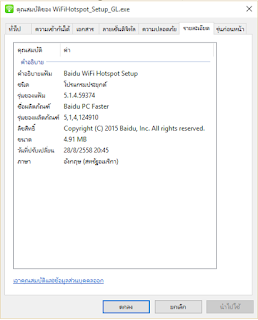 ไม่รอช้า ผมได้โหลดโปรแกรมนี้มาติดตั้งคอมพิวเตอร์ของผม โดยไฟล์มีขนาดไม่ใหญ่นักเพียง 4.91 MB เท่านั้น ใช้งานได้ทันทีไม่ต้องดาวน์โหลดข้อมูลเพิ่มเติม (เมื่อติดตั้งเสร็จแล้วประมาณ 12MB) ลงชื่อแสดงความเป็นเจ้าของโดย Baidu, Inc แต่แอบสะดุ้งชื่อโปรแกรมเล็กน้อย ขึ้นเป็น Baidu PC faster แทน