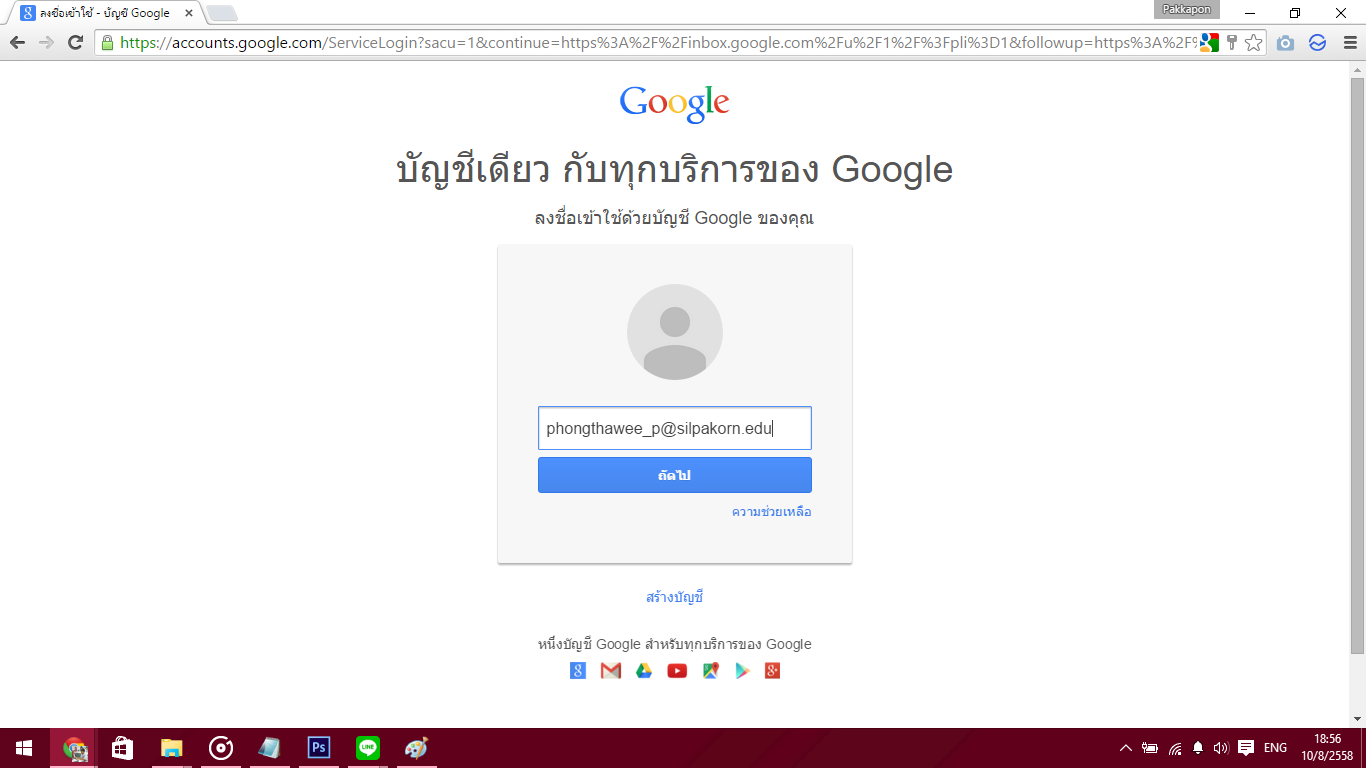 ก่อนอื่นเลยเข้าไปที่ gmail แล้วกรอกอีเมล @silpakorn.edu ลงไปครับ