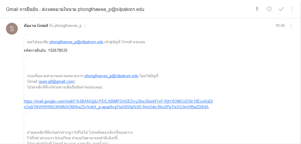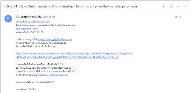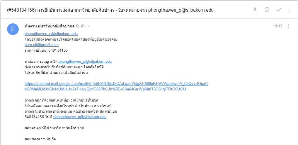 จากนั้นจะมีอีเมลยืนยันส่งมาที่อีเมล @silpakorn.edu ซึ่งถ้าการตั้งค่าส่งต่อเราถูกต้องแล้ว อีเมลนั้นจะเข้าอีเมลหลักด้วยเช่นกัน