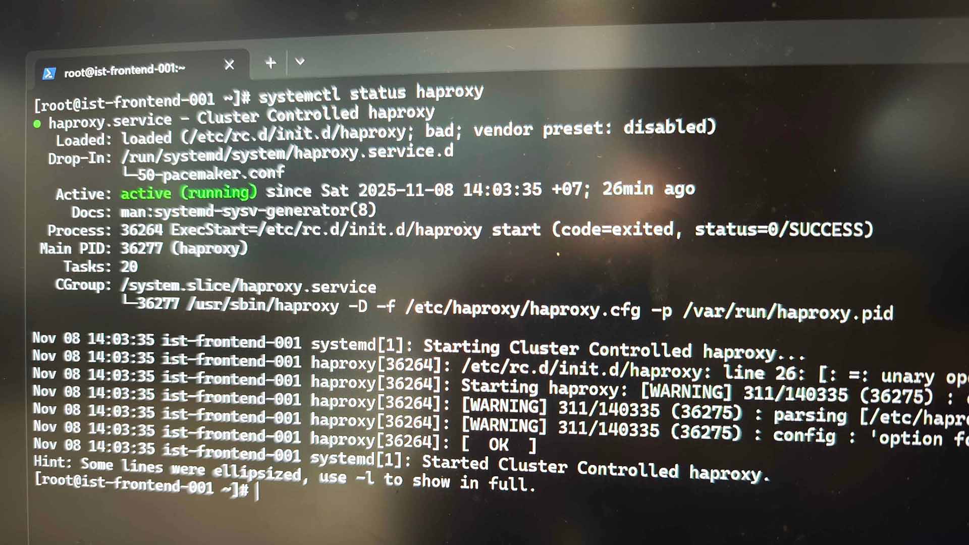 โดยในทั้ง 3 เครื่องปรากฏว่า 210 ยังมี service ของ haproxy รันอยู่ แต่ 211/212 ไม่มี HAProxy รันอยู่ จึงทำการสั่ง systemctl start haproxy บนทั้งสองเครื่อง มันก็กลับมาได้ไปสักพัก แต่พอใช้ๆ ไป haproxy ก็ระเบิดอีก